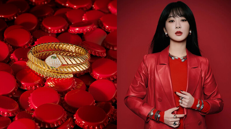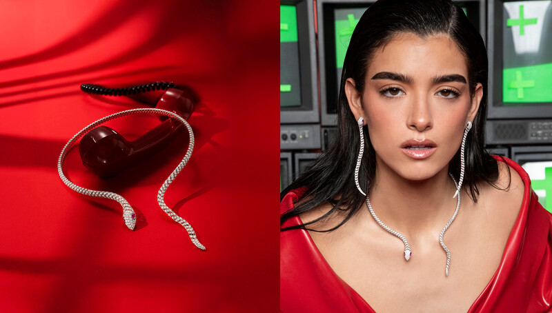 左 : 密镶Kaa缠绕式项圈,右:全球品牌代言人美国歌手Dixie D'Amelio 全球品牌代言人Dixie D'Amelio 演绎全新HIVER系列珠宝,透过蜿蜒曲线的蛇形线条让珠宝更显突出,璀璨闪烁着神秘魅惑之光,透过红宝石蛇眼与蛇鳞镶嵌元素,打造出简约但充满强烈存在感的奢美造型。