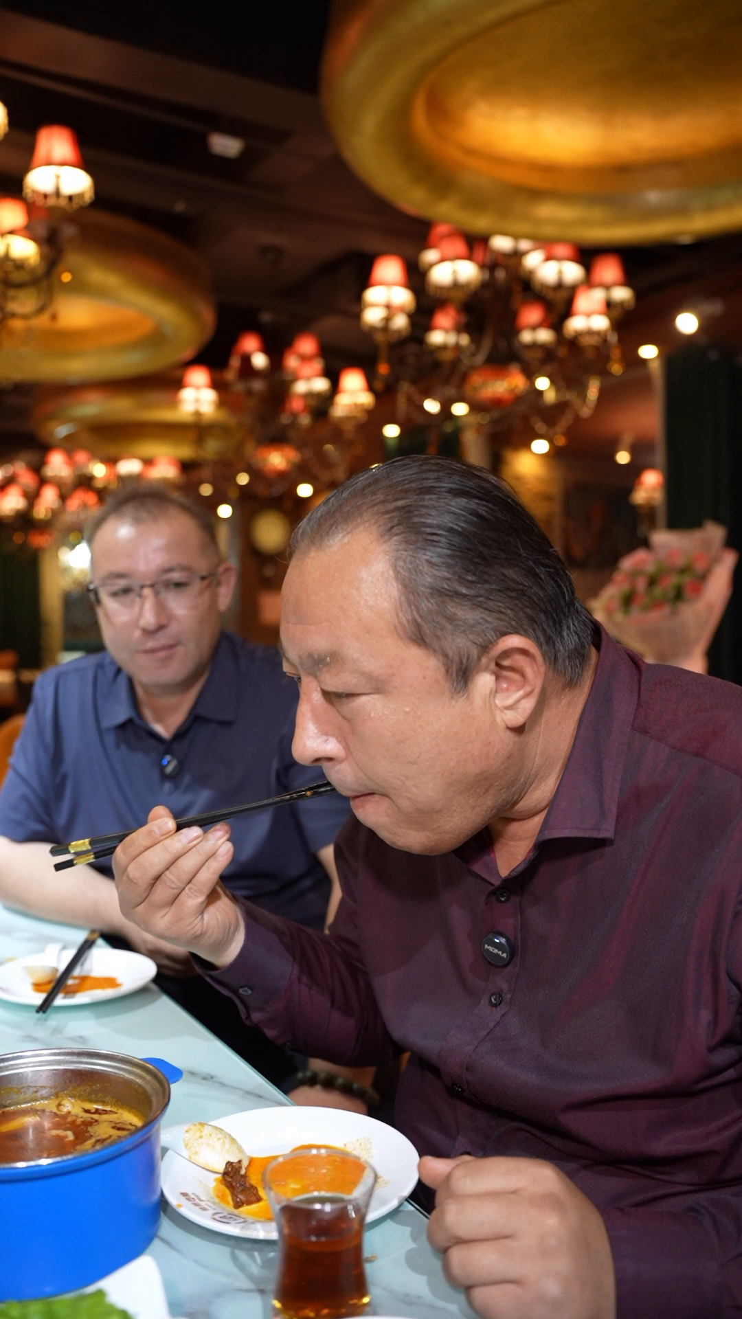 我今天来到了我老家图木舒克市,这有我的画像。这火锅店环境不错,他的名字叫阿不都克依木,是我的弟弟和铁粉丝。火锅店已经开了有6年,这个味道比较符合本地人的口味。这是我们店的一个特色辣子鸡拌面,味道不错。